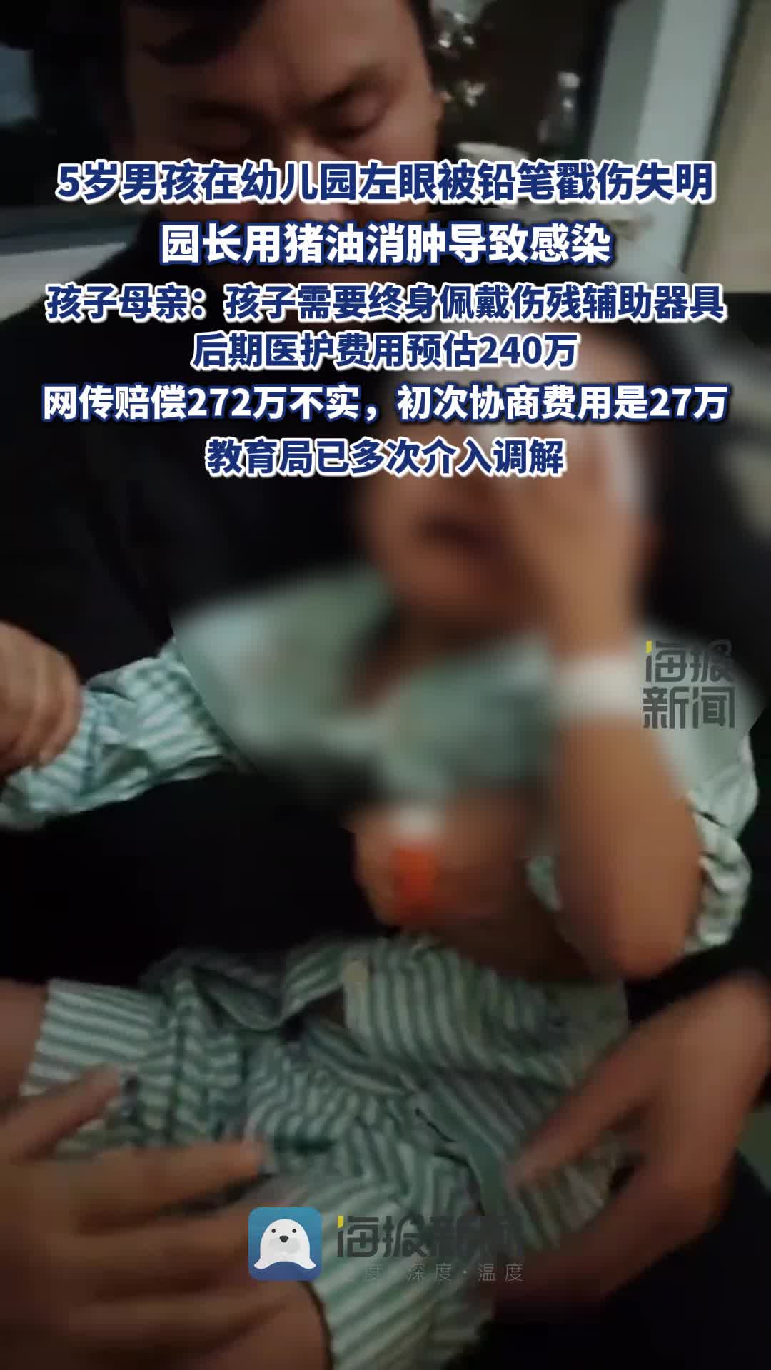 • 5歲男孩在幼兒園左眼被鉛筆戳傷失明,園長用豬油消腫致感染,孩子母親回應“272萬賠償”